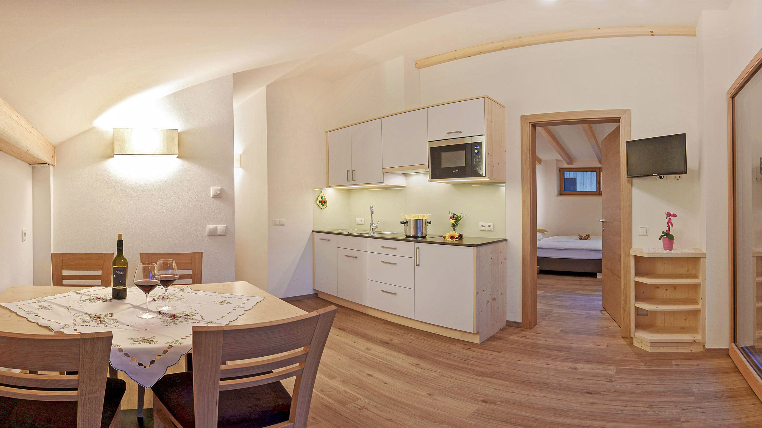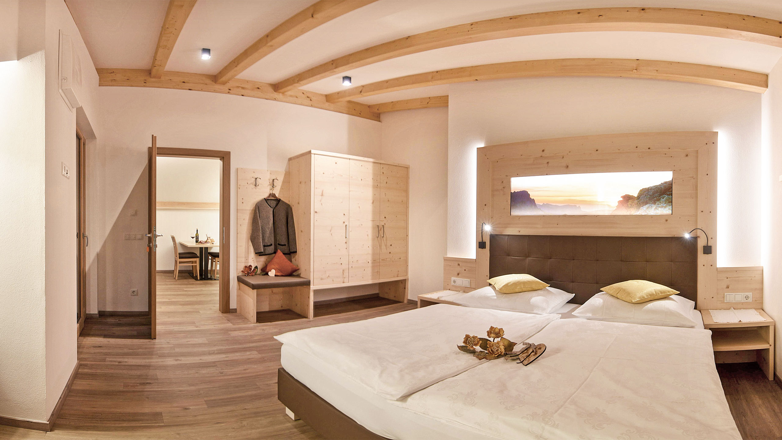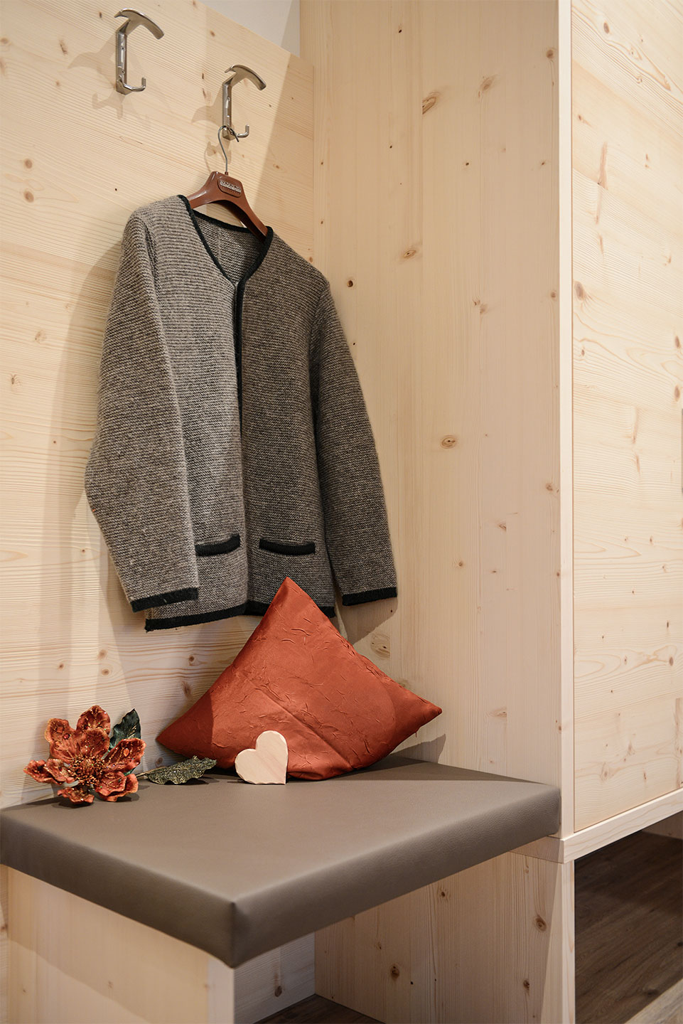 Crafted from real spruce wood, the Cir apartment blends alpine charm with modern comfort. Two spacious double bedrooms, each with a bright and beautiful bathroom, one with a skylight, ensure maximum comfort. The bathrooms include shower, WC, bidet, and hairdryer. A sunny south-facing balcony offers wonderful Dolomite views, while a safe provides extra security.